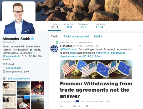 Vuoteen 2016 asti Suomen valtiovarainministerinä toiminut Alexander Stubb ei suostu uskomaan, että TTIP-pankkiylivaltasopimus on kuollut. Stubb jakaa Twitterissä nyt pahamaineisen juutalaispankkiiri Michael Fromanin TTIP-propagandaa.