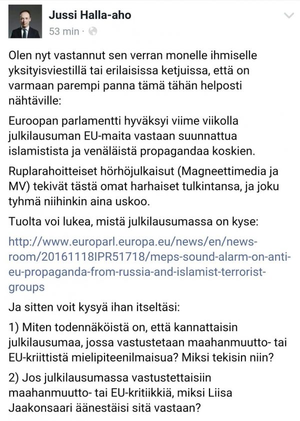 Halla-aho valehtelee kannattajilleen epätoivoisesti, että europarlamentin mietintö olisi koskenut vain ”islamistista ja venäläistä propagandaa”, vaikka kuka tahansa voi lukea mietinnön parlamentin sivuilta ja todeta, että vaihtoehtomedioja, kansallismielisyyttä ja EU-vastaisuutta koskevat lainauksemme ovat autenttisia.