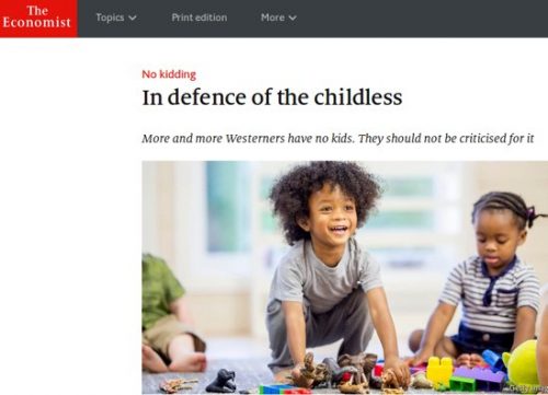 Kansainvälisen finanssieliitin pää-äänenkannattajiin lukeutuva The Economist –lehti käy taisteluun länsimaisen lapsettomuuden puolesta. Alleviivatakseen artikkelin eurooppalaisvastaista sanomaa lehti käytti kuvituksessa potrettia mustista lapsista.