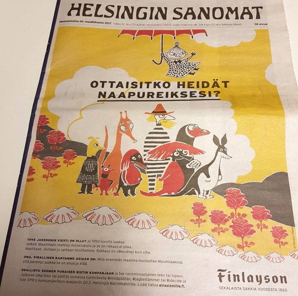 Helsingin Sanomien etusivun mainoksessa Finlayson ihmettelee, miksi suomalaiset suhtautuvat niin penseästi maahantunkeutujiin, jotka kolminkertaistivat raiskaustilastomme muutamassa kuukaudessa. Vastustaisimmeko myös muumien maahanmuuttoa yhtä ankarasti?