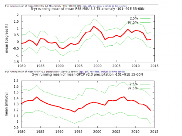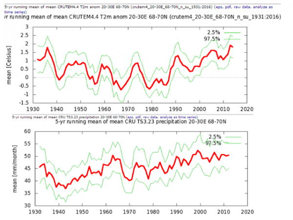 Täällähän näkyy jo isompaaa vaihtelua, kuten pohjoisessa yleensäkin. Valitsin Pohjois-Lapin sarjat eri tietokannasta, sillä meillä sääaikasarjat ovat pidemmältä ajalta kohtalaisen luotettavia verrattuna moniin muihin maailman kolkkiin. Tosiasia on se, että kaikki graafeissa näkyvä muutos mahtuu hyvin luonnolliseen vaihteluun. Kiistämätöntä on kuitenkin Crutem-aikasarjan mukaan se, että Pohjois-Lapissa on hitusen lämmennyt sitten 1960- ja 1970-lukujen kylmien vuosien, ja sillä on käsitykseni mukaan ollut lähinnä elämää vahvistava vaikutus alueen eliöiden, ml. saamelaiset, selviytymiseen. Tähän pätee sama kuin edellä olevaan Amazonasiinkin: Luonnollinen ilmastollinen vaihtelu selittää kaiken.