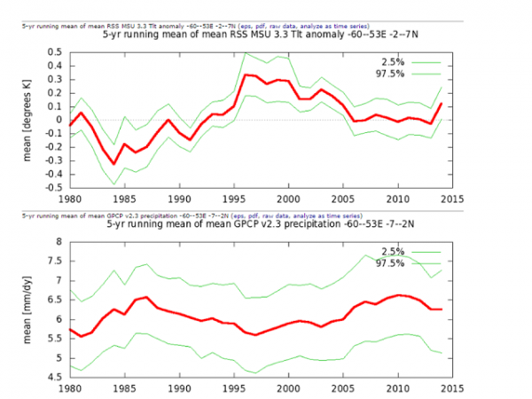Ylemmässä kuvassa on keskilämpötilan muutos asteina viiden vuoden liukuvana keskiarvona (paksu punainen viiva) ja sen laskettu ”normaali” vaihteluväli. Ne on laskettu kuukausikeskilämpötiloista. Alemmassa kuvassa on sadanta (millimetriä päivässä) vastaavasti. Mitään tilastollisesti merkitsevää tai katastrofaalista et noista kuvaajista löydä. Mutta toisaalta eihän päällikkö Arnaldo Kabá Munduruku sellaista väittänytkään. GP vain yritti luoda yhteyden ilmastonmuutokseen.
