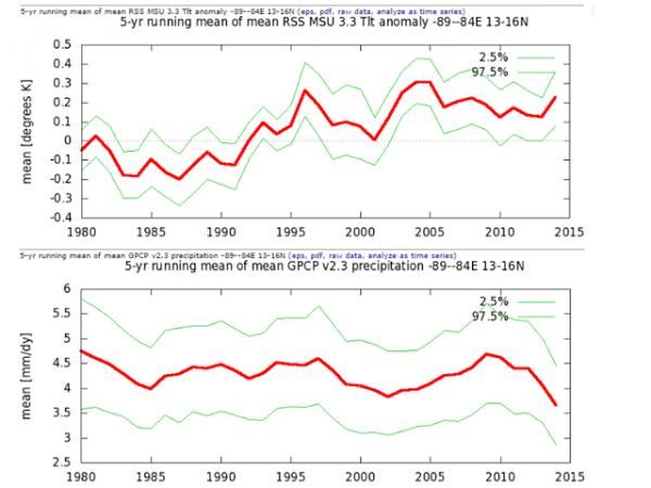 [3]Ylemmässä kuvassa on keskilämpötilan muutos asteina viiden vuoden liukuvana keskiarvona (paksu punainen viiva) ja sen laskettu ”normaali” vaihteluväli. Ne on laskettu kuukausikeskilämpötiloista. Alemmassa kuvassa on sadanta (millimetriä päivässä) vastaavasti. Mitään tilastollisesti merkitsevää tai katastrofaalista et noista kuvaajista löydä. Mutta toisaalta eihän päällikkö Arnaldo Kabá Munduruku sellaista väittänytkään. GP vain yritti luoda yhteyden ilmastonmuutokseen.