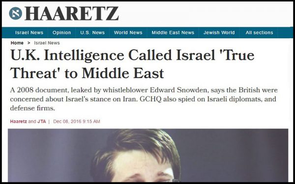 Tuoreen tietovuodon mukaan brittiläinen GCHQ-tiedustelupalvelu pitää juutalaisvaltiota alueen todellisena ruutitynnyrinä, vaikka korruptoituneet poliitikot kutsuvatkin Israelia Britannian ”liittolaiseksi”.