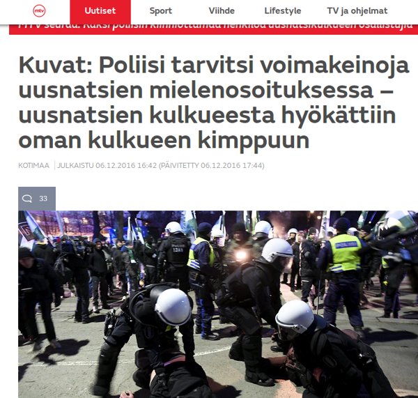 MTV3:n ”uutisen” otsikko oli ”Äärioikeiston mielenosoitusmarssi lähestyy kohti Helsingin keskustaa”. Uutiskuvassa joukko raskaasti varustautuneita mellakkapoliiseja seisoi kiinalaisen ravintolan edessä, ikään kuin suojellen sitä ”äärioikeistolaisilta”.