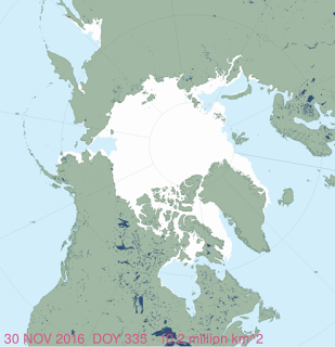 Juu, jääpeite syyskuun alussa oli toiseksi pienin ja käytännössä vuoden 2007 tasolla. Se muuten tarkoittaa sitä, että syyskuinen jääminimi ei ole pienentynyt enää 10 vuoteen. Mitään kovin erityistä ei jään muodostuksessa ole syksyn mittaan kuitenkaan tapahtunut, kuten vieressä oleva jääkartta kertoo. Jäämeren jäätä riittää jo nyt Länsi-Siperiasta Alaskaan ja sieltä Grönlantiin. Jääkarhuilla on reilut 10 miljoonaa neliökilometriä merijään peittämää metsästysaluetta, ja tuo alue vain kasvaa aina maaliskuun puoliväliin asti.