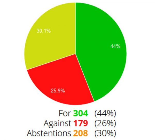 Sananvapautta rajoittavien toimenpiteiden puolesta äänesti kaikkiaan 304 edustajaa (44 %) ja niitä vastaan äänesti 179 edustajaa (26 %). Poissa tai äänestyksestä pidättäytyi 208 edustajaa (30 %).