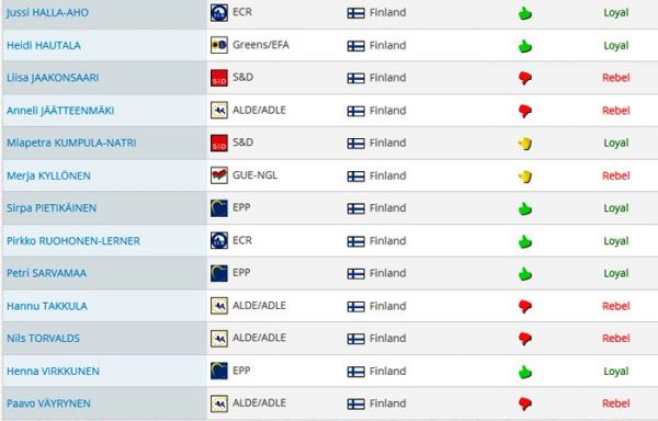 Myös Heidi Hautala, Sirpa Pietikäinen, Pirkko Ruohonen-Lerner, Petri Sarvanmaa ja Henna Virkkunen olivat lojaaleja ryhmilleen. He äänestivät hankkeen puolesta, jonka tarkoitukseksi päätöslauselma ilmoittaa vaientaa EU:n vastaiset mediat ja kansanliikkeet.