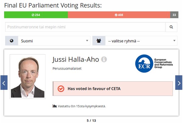 Kuten olemme uutisoineet, Donald Trumpin hallitus tappoi hiljattain TTIP-pankkiylivaltasopimuksen. Ikävä kyllä, TTIP:n takaporttina toimiva CETA-sopimus on edelleen hengissä. Perussuomalainen Jussi Halla-aho lobbaa nyt ahkerasti CETA:n puolesta europarlamentissa.