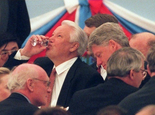 Boris Jeltsin ja Bill Clinton juhlatuulella 1995.