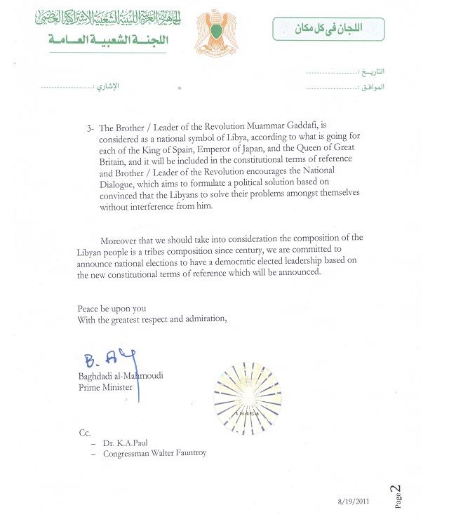 Kymmenen päivän kuluttua rauhansopimus tavoitti Libyan tuolloisen pääministerin Baghdadi al-Mamoudin, presidentti Muammar Gaddafin sekä USA:n hallinnon yhdessä presidentti Barack Obaman ja Valkoisen talon kanssa. Sopimus näytettiin vielä USA:n armeijan silloiselle kenraali Clarkille, kuin myös USA:n republikaanien Dennis Kucinishille.