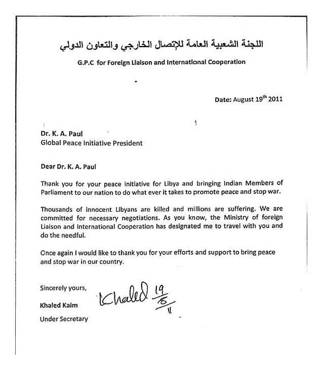 Tri Paul saapui Libyaan 5. elokuuta 2011 mukanaan joukko Intian parlamentin jäseniä rauhankomiteasta.