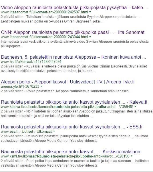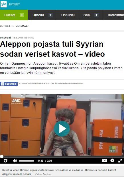 Kuitenkin Yleisradion henkilökunta riensi välittömästi levittämään jihadistien propagandaa otsikolla “Aleppon pojasta tuli Syyrian sodan veriset kasvot”.