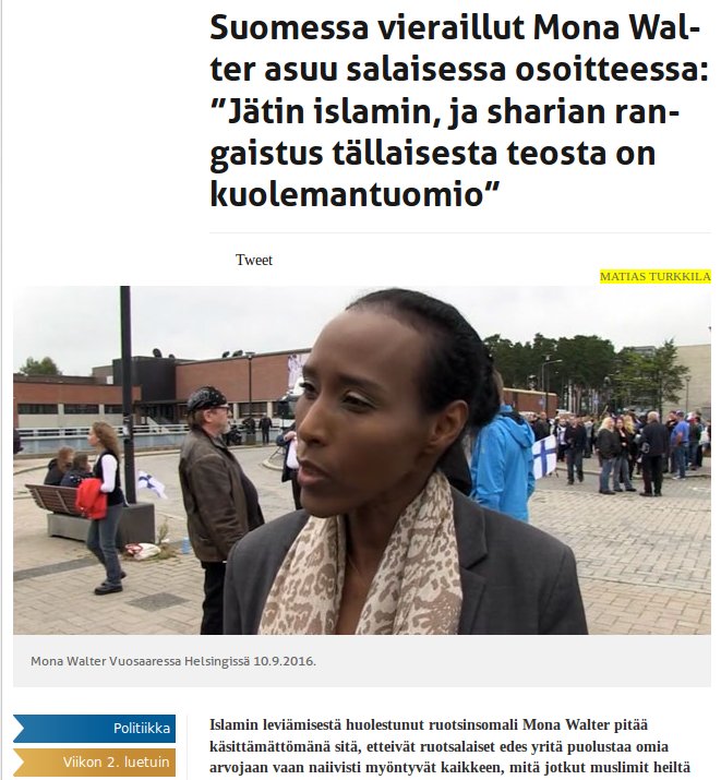 Muun muassa perussuomalaisten puoluelehti haastatteli Vuosaareen puhumaan saapunutta somalia Mona Walteria, joka ei ollut kiinnostunut niinkään maahanmuutosta vaan islaminuskon vastustamisesta. Walter asuu Ruotsissa.