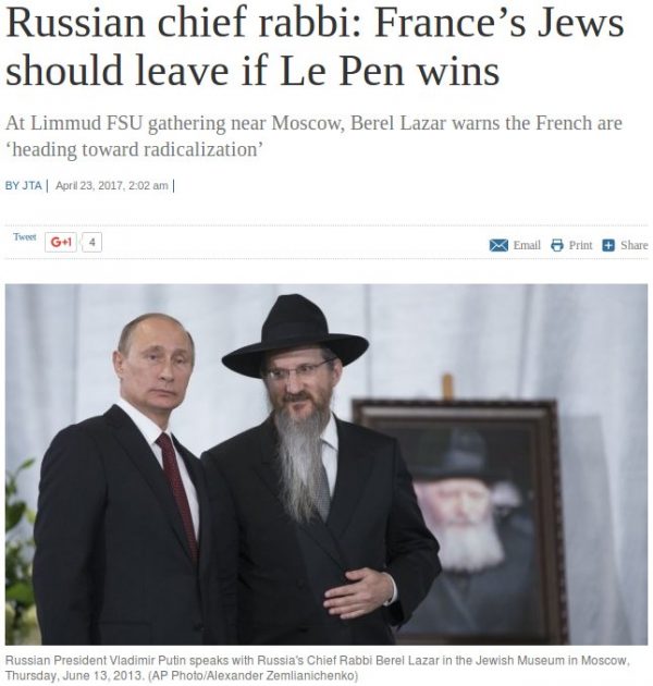 Macronin vaalivoitto on useiden vaikutusvaltaisten juutalaisten mukaan nyt kohtalonkysymys heidän heimonsa kannalta. ”Putinin henkilökohtaiseksi rabbiksi” kutsuttu Venäjän juutalaisjohtaja Berel Lazar antoi hiljattain julkilausuman, jonka mukaan juutalaisten tulisi jättää Ranska ja muuttaa Venäjälle, mikäli Le Pen voittaa.