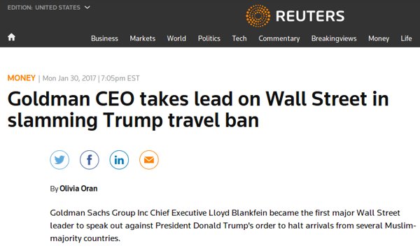 Reutersin uutinen on otsikoitu: ”Goldmanin toimitusjohtaja johtaa Wall Streetia taistelusssa Trumpin matkustuslakia vastaan [3]”. Goldmanin toimitusjohtaja on juutalainen Lloyd Blankfein, joka tuki vaalien aikana näkyvästi Hillary Clintonia. Vaalien jälkeen Goldman hyppäsi nopeasti voittajan puolelle [4] ja on pyrkinyt korruptoimaan Trumpin hallituksen. Mutta onko korruption hammas ollut Goldmanin näkökulmasta tarpeeksi terävä?