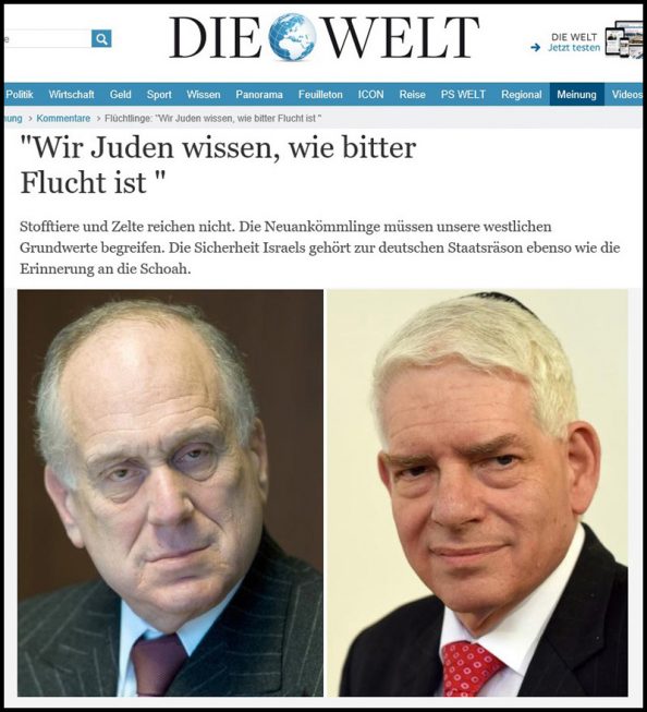 WJC-johtaja Ronald Lauder ja juutalaisneuvoston johtaja Josef Schuster kommentoivat pakolaiskriisiä suuren Die Welt –lehden artikkelissa ”Me juutalaiset tiedämme, millaista on olla pakolainen”.