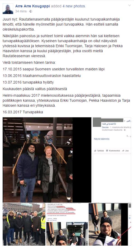 Näköjään painostus ja suhteet toimii vaikka aiemmin hän sai kielteisen turvapaikkapäätöksen. Kyseinen turvapaikanhakija on ollut näkyvästi yhdessä kuvissa ja tekemisissä Erkki Tuomiojan, Tarja Halosen ja Pekka Haaviston kanssa ja kuului pääjärjestäjiin, jotka osoitti mieltä Rautatieaseman vieressä.