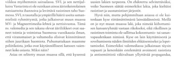 ”SVL [Pohjoismainen Vastarintaliike. Toim. huom.] ja sen nettijulkaisu [Kansallinen] Vastarinta ei ole suinkaan ainoa äärioikeistolainen natsiaatteita ihannoiva ja levittävä rasistinen taho Suomessa.