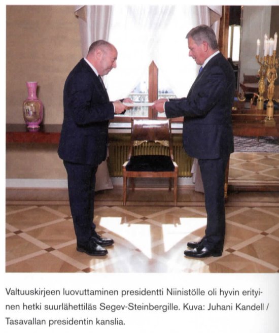 Segev-Steinbergin juuret ovat juutalaisessa Haganah-terroristijärjestössä, joka teki yhteistyössä muiden asellisten ryhmien kanssa miehitetystä Palestiinasta etnisen juutalaisvaltion. Nyt Segev-Steinberg jutustelee tuttavallisesti Suomen presidentin kanssa, jota Haganah-terroristikytkökset eivät vaikuta haittaavan.
