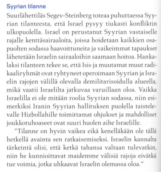 Israel ei myöskään tunnu pitävän al-Qaidan ja Isisin läsnäoloa Israelin rajan tuntumassa ”hankalana”, vaikka Segev-Steinberg niin väittääkin. Israel nimittäin kaavailee jopa sionistien ja ääri-islamistien yhteisiä aseistettuja joukkoja terroristien valtaamalle alueelle eteläisessä Syyriassa.