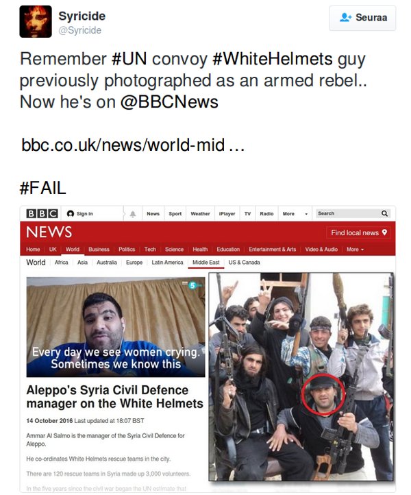 Ilta-Sanomat ja muut suomalaisjulkaisut aina Yleisradiota myöten kuvittavat nykyään Syyria-uutisensa lähes aina niin sanotun Valkoiset kypärät –järjestön (viralliselta nimeltään Syyrian siviilipuolustus, Syrian Civil Defence) PR-toimiston potreteilla. Näin tehdessään valtamedia tukee järjestelmällisesti ääri-islamististen terroristijärjestöjen toimintaa.