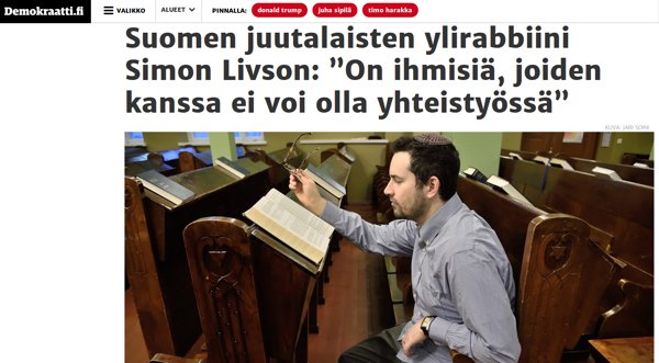 Helsingin juutalaisyhteisön ylirabbiini Simon Livson antoi viime viikolla SDP:n Demokraatti-puoluelehdelle vähintäänkin hämmentävän haastattelun. Hänen mukaansa esimerkiksi suomalainen valtamedia on liittoutunut sionisteja vastaan.