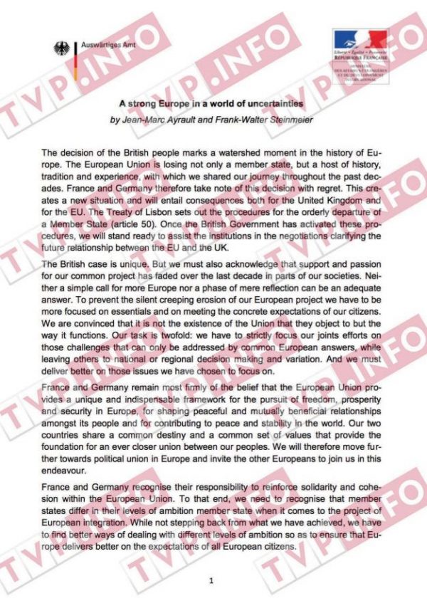 Ajankohtaisohjelma Minęła 20 ja tvp.info -portaali saivat käsiinsä suunnitelmaa kuvaavan 9-sivuisen dokumentin, jonka ovat allekirjoittaneet Saksan ja Ranskan ulkoministerit.