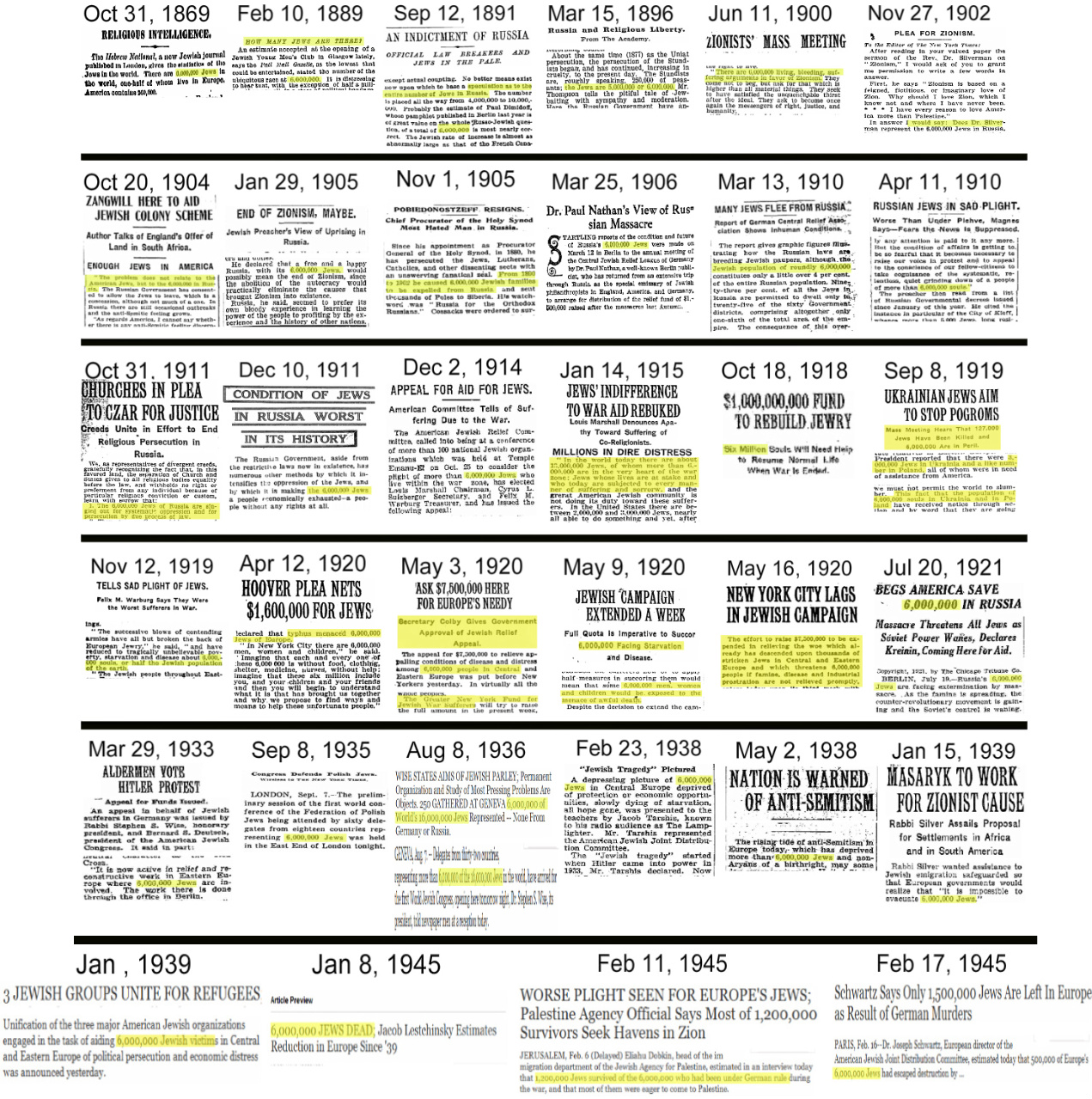Don Heddesheimerin teos The First Holocaust: Jewish Fundraising Campaigns With Holocaust Claims During and After World War One todistaa, että juutalaiset toistivat 6 000 000 uhrin mantraansa kymmeniä kertoja jo kauan ennen Hitlerin nousua valtaan. Jo vuonna 1900 rabbi Stephen S. Wise puhui ”6 000 000 elävästä, verta vuotavasta ja kärsivästä argumentista sionismin puolesta”.