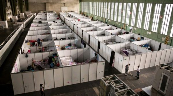 Yksi toimittajan kokemista vastaanottokeskuksista oli Tempelhofin suljetun lentokentän vanhaan hangaariin rakennettu majoitustila.