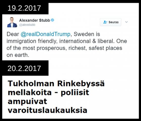 Tukholman Rinkebyn kaupunginosassa vuonna 2014 ulkomaalaistaustaisten osuus oli 90,7 prosenttia väestöstä. Juuri kun Amerikan Yhdysvaltojen presidentti Donald Trump oli sanonut, että Ruotsi on vaikeuksissa, ja ”liberaalimedia” oli ilkkumassa Trumpin näkemystä aivan vääristyneeksi ruotsalaista humanitaarista suurvaltaa vastaan, niin Tukholman ongelmat tulivat taas näkyviin.