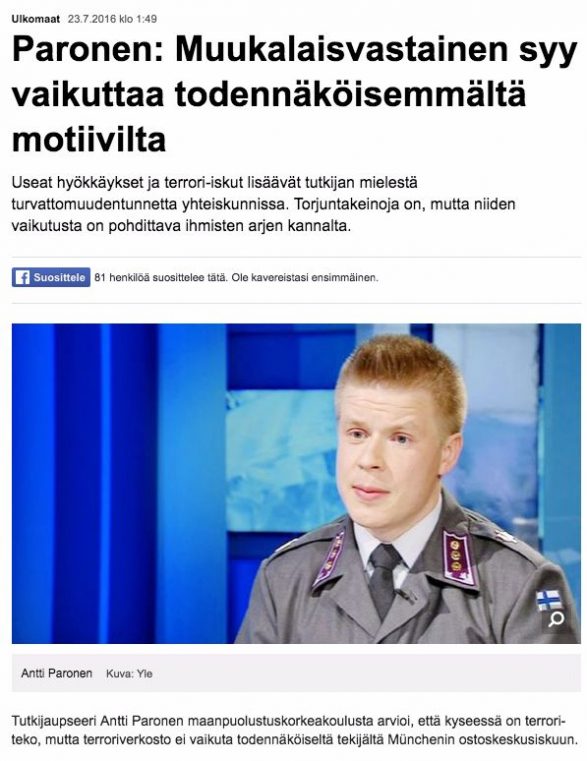 Yle julkaisi viikonloppuna yöllä uutisen otsikolla “Paronen: Muukalaisvastainen syy vaikuttaa todennäköisemmältä motiivilta”. MV-lehti huomasi, kuinka uutisen sisältöä vaivihkaa manipuloitiin.