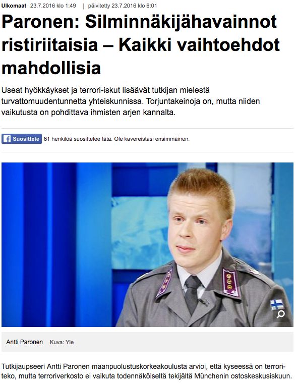 Ampuja tiedettiin iranilaistaustaiseksi ainakin MV-lehdessä jo noin klo 3:30, eli kaksi ja puoli tuntia aikaisemmin, kuin milloin Yle väärensi vanhan uutisensa. Ylellä oli uutista väärentäessään aivan varmasti tieto siitä, että ampuja oli lähi-itäläistaustainen, jolloin väite “kaikkien vaihtoehtojen” mahdollisuudesta ei pitänyt paikkaansa.