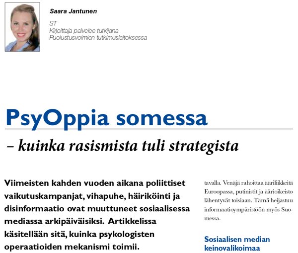 Upseeriliitto julkaisi tuoreeltaan Saara Jantusen kirjoittaman artikkelin ”PsyOppia somessa – kuinka rasismista tuli strategista”. Artikkelin perusajatus on, etteivät jatkuvat maahanmuuttovastaiset mielenosoitukset kerro mitään kansalaisten maahanmuuttoasenteista. Sen sijaan mielenosoitukset tulisi tulkita Vladimir Putinin sotilaallisiksi voimannäytöiksi.