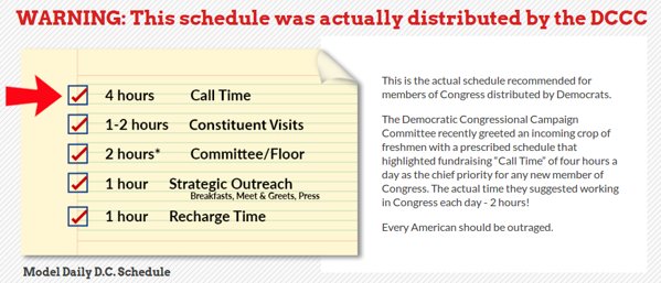 Aikataulurungon mukaan kansanedustajien tulisi kerjätä rahaa joka päivä neljä tuntia ja työskennellä todellisissa tehtävissään kongressissa vain kaksi tuntia päivässä! Toisin sanoen maailman ”johtavaa demokratiaa” pyörittävät ihmiset, joiden mielestä korruption edistäminen on kaksi kertaa lakien säätämistä tärkeämpää.