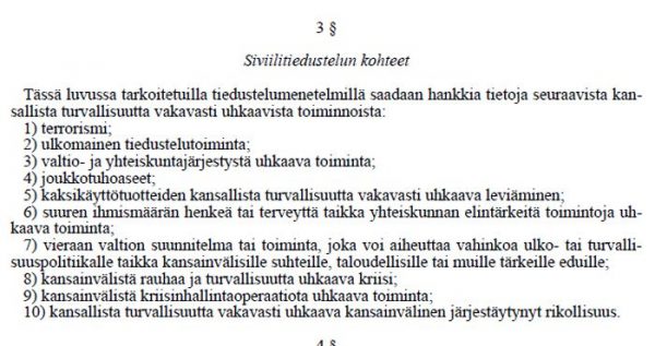 Uuden lain 5a luvun 3 §:ssä määrätään siviilitiedustelun kohteet paperilla, mutta valitettavasti lainlaatijan selitysosa tekee erityisesti vallitsevan poliittisen ilmapiirin ja hysterian avaimeksi kohdan 7 käytölle, koska näitä kohtia ei ole nimenomaisesti sidottu edes rikosepäilyyn.