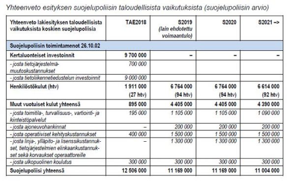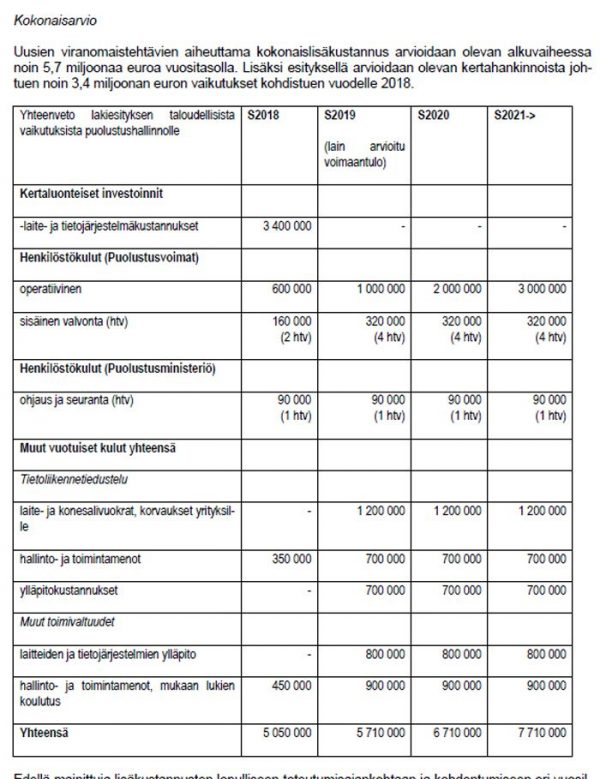Sisäministeriön julkaiseman selvityksen mukaan suojelupoliisin kulut kasvaisivat yli 12 miljoonaa euroa vuodelle 2018 lakiesityksen johdosta (s. 158). Lisäksi sisäministeriön toimintamenot kasvaisivat vuosittain noin 350 000 euroa (s. 159).