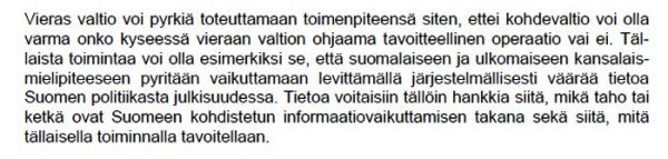 ”Tällaista toimintaa voi olla esimerkiksi se, että suomalaiseen ja ulkomaiseen kansalaismielipiteeseen pyritään vaikuttamaan levittämällä järjestelmällisesti väärää tietoa Suomen politiikasta julkisuudessa. Tietoa voitaisiin tällöin hankkia siitä, mikä taho tai ketkä ovat Suomeen kohdistetun informaatiovaikuttamisen takana sekä siitä, mitä tällaisella toiminnalla tavoitellaan” (s. 189).