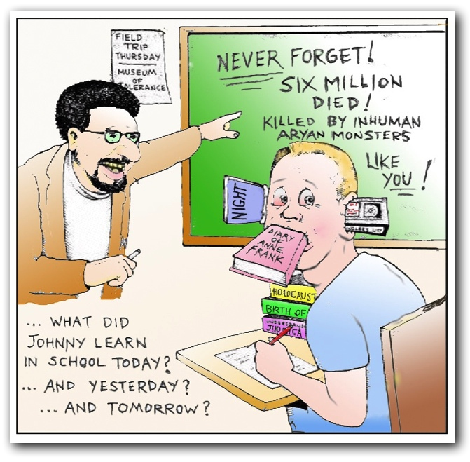 Ei-juutalaisten väestö länsimaissa on jo vuosikymmenien ajan hukutettu ja kyllästetty jatkuvalla vyöryllä holakausti-aiheisia Hollywood elokuvia, televisio-ohjelmia, ”dokudraamoja”, kirjoja ja muistelmia, sekä pakollisella ”holokaustiopetuksella” koulussa halki Amerikan ja Euroopan. Tämän salakavalan maailmanlaajuisen propagandakampanjan päätavoite on yksinkertaisesti aivopestä ei-juutalaiset säälittävän pelon ja jähmettyneisyyden tilaan, kun meitä samalla alistetaan ideologisesti, taloudellisesti ja fyysisesti juutalaisen eliitin toimesta. Sen tarkoituksena on myös tehdä laittomaksi kaikki kritiikki juutalaista eliittiä ja Israelia kohtaan sekä houkutella ei-juutalaiset omaksumaan juutalais- ja sionistimyönteinen maailmankuva. Inhottavine holokaustivalheineen sionisti-myytintekijät opettavat nuoria koululaisia vihaamaan saksalaisia ja eurooppalaisia ylipäänsä. Nämä lapset, jotka eivät tiedä muusta eivätkä osaa itse vielä ajatella, uskovat sokeasti nämä tarinat eivätkä tule koskaan kyseenalaistamaan heille opetettuja asioita kasvettuaan aikuisiksi. Lapsiin iskostettu sionistien holokaustifiktio vahingoittaa nuorten mieliä pysyvästi. Lasten ja nuorten pakkosyöttäminen vääristetyillä tiedoilla ja selvillä valheilla II Maailmansodasta heidän saamiseksi sympatisoimaan juutalaisia ja heidän petollisia tavoitteitaan, kuten sionismi ja kommunismi, on moraalitonta, tuhoisaa ja rikollista. Sen täytyy loppua!