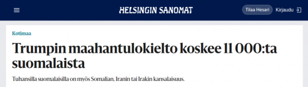 Juutalaisen Erkko-säätiön äänitorvi Helsingin Sanomat esimerkiksi alkoi väittää, että 11 000 ”suomalaista” joutuu nyt kärsimään suoraan Donald Trumpin päätöksestä. Lehden sivuilla luki kissankokoisin kirjaimin: ”Trumpin maahantulokielto koskee 11 000:ta suomalaista”.
