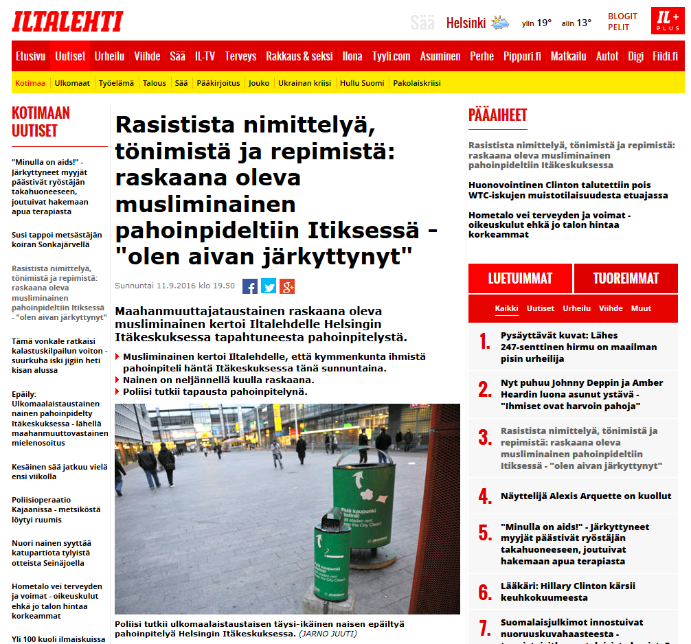 Valtavirtainen valemedia uutisoi eilen ja tänään näyttävin otsikoin, että ”raskaana oleva musliminainen pahoinpideltiin” maahanmuuttovastaisen Itis-mielenosoituksen liepeillä. Uutisoinnin implisiittinen viesti oli, että maahanmuuton vastustaminen johtaa rasistiseen väkivaltaan, minkä vuoksi tiukempaa rajapolitiikkaa vaativat mielenosoitukset tulisi kieltää.