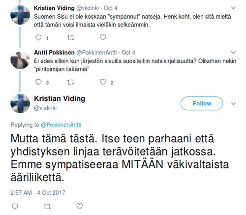 Viding puolestaan on mukana Kokoomuksen toiminnassa, vaikka Orpon ja Stubbin puolue kantaa suurimpana hallituspuolueena raskaimman vastuun Suomen pakolaiskriisistä. Sisu on kehunut julkisuudessa, kuinka järjestöön kuuluu lähes kaikkien puolueiden edustajia. [13] Eikö kansallismielisten tulisi kuitenkin nimenomaan pyrkiä vastustamaan Kokoomuksen, Keskustan ja Sdp:n kaltaisia globalistipuolueita? Miksi ihmeessä kansallismieliset päästäisivät vihollisen selustaansa? Eikö nyt jos koskaan ole aika vetää selkeä raja meidän ja maanpetturipuolueiden välille?