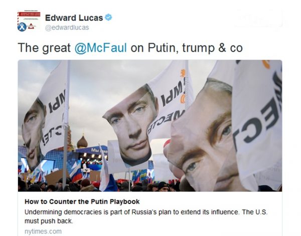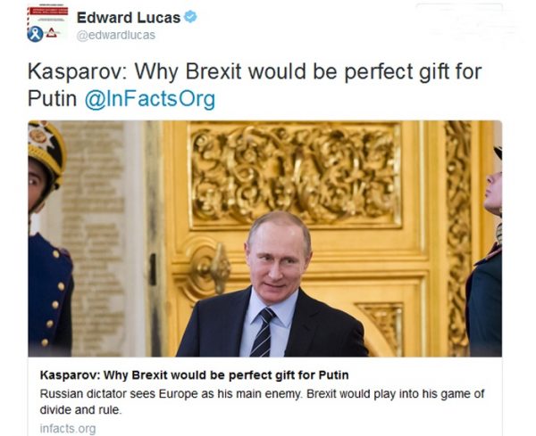 Washingtonilaisen CEPA:n raportin toisena pääarkkitehtina Edward Lucas on nähnyt vuosien varrella Venäjän informaatiosodallisen osallisuuden mitä moninaisimmissa asioissa. 13. toukokuuta Lucas levitti twitterissään Kasparovin lausetta, että Brexit on täydellinen lahja Vladimir Putinille.