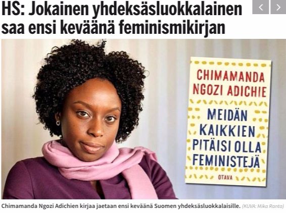 Valtamedia uutisoi tänään, että kaikille suomalaisille yhdeksäsluokkalaisille annetaan veloituksetta afrikkalaistaustaisen feministin kirjoittama kirja nimeltään Meidän kaikkien pitäisi olla feministejä. Tuusulalainen opettaja ilmoitti, ettei aio olla mukana propagandahankkeessa.