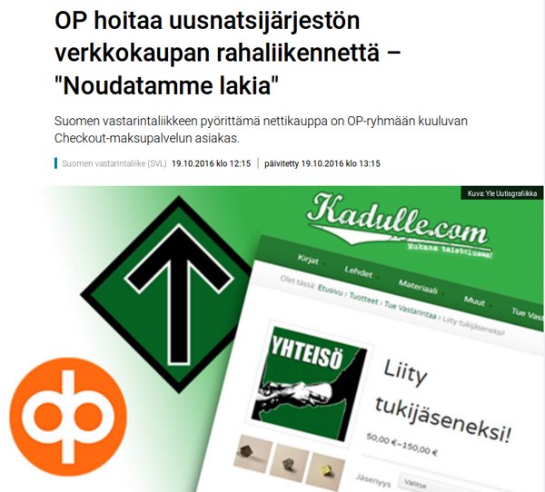 Yle-toimittaja Sara Rigatelli julkaisi artikkelin siksi, että hänen mielestään ”natseilla” ei ole oikeutta pyörittää verkkokauppaa, vaikka verkkokaupan toimintaan ei liittyisikään mitään laitonta.
