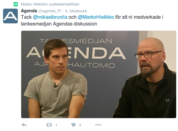 Vastarintaliikkeestä usein kirjoittanut Yleisradion toimittaja Marko Hietikko osallistui hiljattain poliittiseen keskustelutilaisuuteen, jossa hän esiintyi yhdessä Varisverkoston perustajasisäpiiriin kuuluvan Mikael Brunilan kanssa.