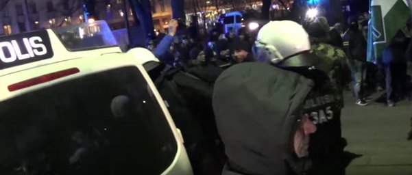 Kohdassa 5.50 poliisi alkaa taputella isällisesti maassa makaavaa Jari Lainetta vatsaan ja pyytää häntä nousemaan pystyyn. Laine kertoo poliisille olleensa vastustamassa ”natseja”. Poliisille oli siis täysin selvää, että samaan autoon laitettiin kaksi vihamiestä, joista yhden kädet olivat vapaat ja toisen taas ei.