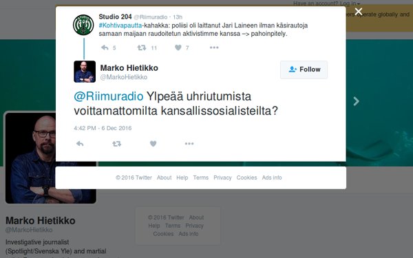 Yle-toimittaja Marko Hietikko naureskeli raudoitetun mielenosoittajan pahoinpitelylle