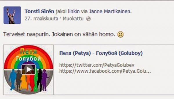 Sitten hän paljastaa enemmän syistä, miksi ei ollut Pride-kulkuessa: ”Valitettavasti olin Lappeenrannassa mökillä saunomassa kyseiseen aikaan skottilaisen aviomieheni kanssa.”