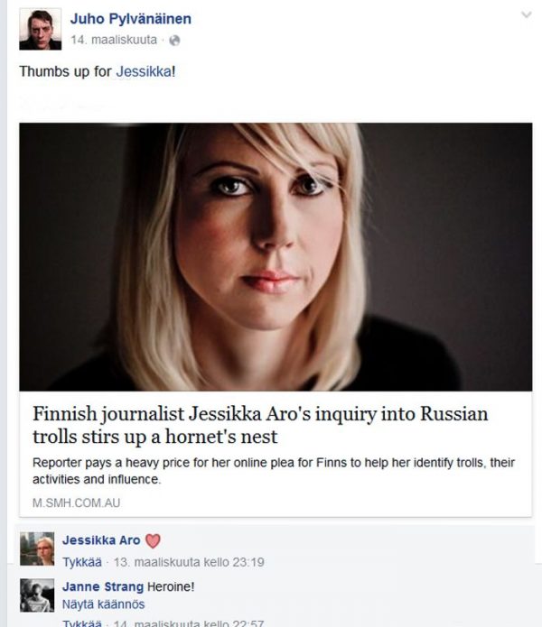 Kuvakaappaus Juho Pylvänäisen Facebook-sivulta. Vain yksi esimerkki läheisestä vuorovaikutuksesta Jessikka Aron kanssa.